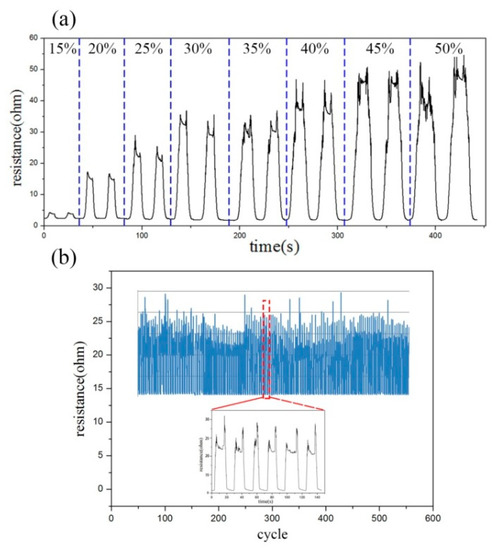 The conductive fabric resistance shows hysteresis after the cyclic stretching of large strain, due to the large strain effect. This finding verifies that the knitting sensor area enters the mid-swing. With the same stretching rate, the same sensing area was stretched by 15%–50%. Figure 4a shows that at a low strain variable of 15%, the resistance of the sensing area shows good monotonicity, increases during stretching and decreases during recovery. However, after the tensile amount reaches 15% and 20%, a second increase is observed in the resistance curve. Thus, when the fabric is stretched, the resistance increases slightly and then decreases to form the first peak. The same phenomenon occurs in the stretch-recovery to form the second peak.