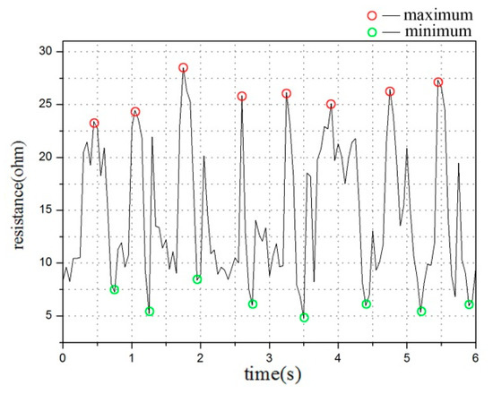 First, we used the peak computing function findpeaks of Matlab to seek peaks and valleys within unit time and conduct data detection. The movement characteristics and our resistance waveform show that, in unit time, the highest resistance change period and the maximum and minimum values of the resistance are observed when the human body is running. These values are all relatively larger than those of the other three movement periods. With the use of this algorithm, we accurately distinguished running from the other three sports (Figure 6).