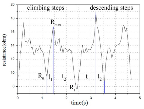 Comparison using the method of time axis comparison states that the movement is a climbing or descending step, when only one maximum value of resistance is observed within the same period and the change of resistance value is monotonous (Figure 7). If the time (t1) taken from the initial resistance (R0) to the maximum resistance (Rmax) is greater than the time (t2) taken from the end resistance (R1), then the movement is descending steps. By contrast, if the time t1 is less than t2, then the movement is the climbing steps. Extracting the characteristic value by fitting the linear function or matrix and using calculus is relatively complicated and difficult. [9,11,15] In this work, the characteristic range value of the resistance, the calculation function of the peak value and the time comparison of the peak and valley point were used for evaluation.
