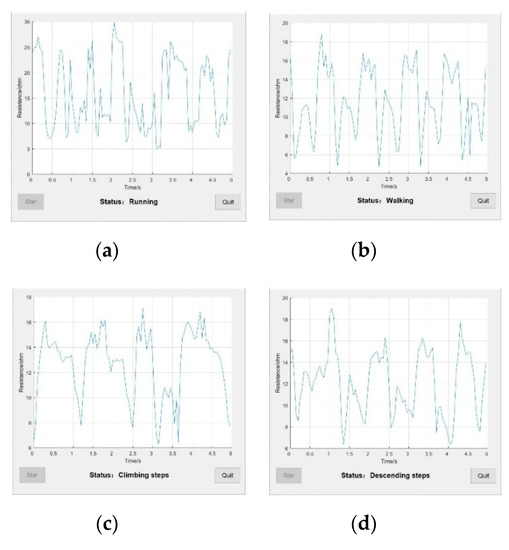 Two contact electrodes were connected to the specified stretch and recovery area to measure the resistance on the knitted fabric surface and resistance variations were studied. The floating line was hooked on the opposite side of the fabric to the front and welded together with the two electrodes by using the welding material as the metallic tin. The relationship between resistance and time of knee joint in running, walking, climbing and descending steps was tested. Ten subjects (five males and five females, age range of 20–30 years) performed four different activities according to a fixed sequence and experimental protocol shown in Figure 1c. A large data set must be collected to meet the identification needs suitable for many users. Thus, the subjects were asked to perform each activity for approximately 2 min.