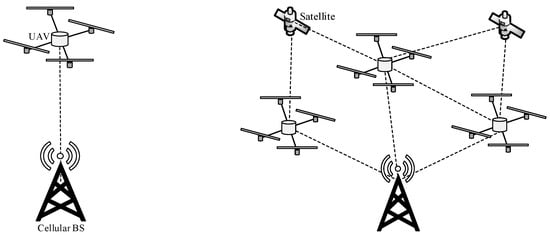 - a UAV–satellite link, which is a long-range terrestrial link, between a UAV and a satellite. The UAVs can form a star topology with the satellite. This link is necessary in the absence of other radio access infrastructure (i.e., FANET BS and cellular BS).