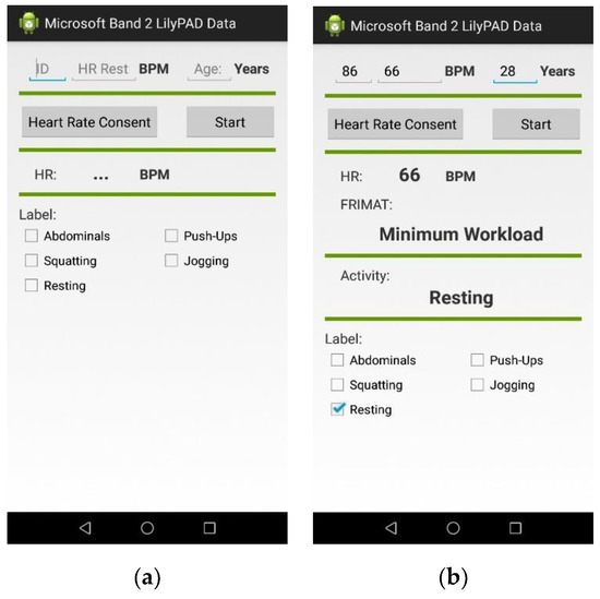 For the HR tracking, a Microsoft Band performs HR sampling with a built-in PPG sensor [44]. This wearable enables the tracking of other fitness-related variables such as sweating, arm movement and step counting, among others [44]. This device has been validated by different authors for HR monitoring [45,46]. For this work, we only required the HR sensor; and therefore, other sensors are deactivated to save energy. A specialized Software Development Kit (SDK) for Android devices permits the control of the Microsoft Band. This SDK can be found in [47]. We develop a mobile application that connects automatically to both sensors and has two operating modes: training mode and testing mode.