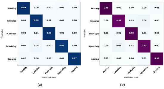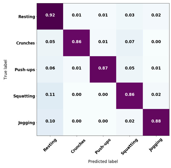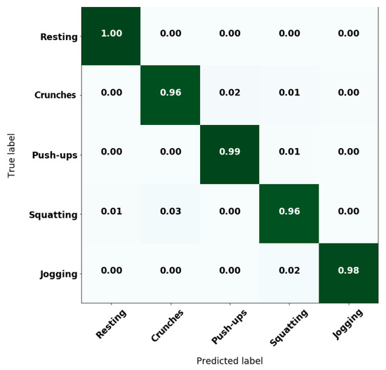 Collected data from the volunteers was separated by assigning 70% to a training subset and 30% for a validation subset, following a proper data randomization to avoid underfitting. Then, RF estimators were trained varying the number of trees from 2 to 100, and kNN with the number of neighbors from 2 to 50. These values are chosen after noticing that there was not a significant improvement on overall accuracy by increasing the number of trees or neighbors, respectively. Best results show an overall accuracy of 97.7% for RF with 63 trees and 95.2% for kNN with five neighbors. The normalized confusion matrices for both algorithms are displayed in Figure 3. These confusion matrices evince the difference in the overall accuracies by exhibiting less confusion in crunches, push-ups and squatting for the RF algorithm compared to kNN. Such results were obtained using the validation subset. Consequently, optimization efforts were conducted towards RF.