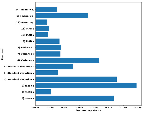 For dimensionality reduction, the level of importance that each feature has during training was analyzed. The importance levels considered here were equivalent to Gini importance, which is described in [49]. This importance was computed considering the decrease in average accuracy for the trained trees when a feature value was varied randomly. Thus, significant accuracy detriments point to the significant importance for a feature. In the case of the scikit-learn library, the feature importance levels are normalized. Figure 4 displays a bar graph of the feature importance. As observed, it was clear that , MAD(y), MAD(z) and were the features with the lower significance; and therefore, we proceeded to remove them from the feature vectors. Even though further reduction in the number of features reduced the code size that would be embedded in the mobile application; extra reductions could also compromise the classifier performance. Thus, we decided to work with the new feature set of 11 features; but therefore, the model needs to be retrained with this new set.