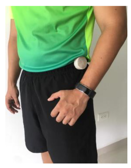 This second case study set its focus on testing the workload estimator reliability. For this purpose, a 27-year-old healthy male subject volunteered to participate in a twenty-day experiment. The subject performed the same exercise routine every day, and its physical workload was recorded. In our system, the collection of workload data was linked to the activity recognition function in order to provide meaningful insights of physical performance. Then, the tests set-up implies that the subject must wear both devices during each session. Figure 8 shows how the subject wears the devices and evinces that they do not represent major discomfort. Before the first session, a preliminary exercising round reveals that crunches do not represent significant physical effort for the subject. Thus, the routine for each day is defined as follows: 15 s of resting to find the reference HR for workload estimation, followed by 60 s of push-ups, 60 s of jogging, 60 s of squatting and 60 s of resting. Then, the one-minute rounds are repeated three times.