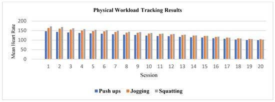 Additionally, Table 5 shows the performance stability of the online HAR component during the second case study. The accuracies stood around 90% for the three activities, considering the fatigue effect on the subject movements. It also must be noticed that these experiments were longer than in the first case study and exhibited higher average accuracy; this is due to the lack of heterogeneity, which leads the system to be exposed to more similar movements each session. Thus, these results confirmed the reliability of the two components of our system for workload tracking purposes.