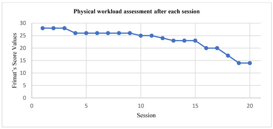 Regarding the second case study, it helps us to validate the reliability of the workload computation in real-time. This approach differs from other workload-related works like [21,22,23,24] where there is no real-time feedback. Instead, authors from [21,22,23,24] take activity and HR data manually and then compute the workload and categorize it. The proposed system does all this process automatically, facilitating the relationship between activity and physical effort, which takes relevance at the application field. The subject considered for the twenty-day experiment of the second case study performed a physically demanding routine that was evaluated as extremely hard at the end of the first ten days, according to Frimat’s criteria. However, a remarkable evolution in the perception of each activity by the subject is shown in Figure 9. In the first sessions, the system evaluated that each type of exercise was extremely hard for the subject, obtaining an average HR of 150 bpm, then in the last session these activities were classified as a light workload, obtaining an average HR of 95 bpm. As expected, the first exercise of the routine (push-ups) displayed the lowest workload amounts, since the body started to adapt to the routine. However, as the exercising round advances, the HR started to increase, which was reflected in higher workloads. Another evidence of the assimilation of the exercising routine was the change from Frimat’s scored values in the resting periods at the end of each session, as shown in Figure 10. Considering that the subject always performed the same exercise routine for twenty sessions (that is, there was no increase or variation in the load), a principle of adaptation is presented in the physical state of the subject [53,54,55]. As can be seen in Figure 9 and Figure 10, at the beginning of the sessions, the physical capacity of the subject was not enough for the established load, but as the exercise sessions increased, the body managed to adapt to that load.