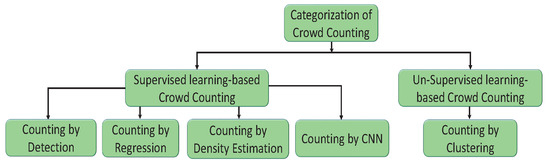 A crowd is defined as a large gathering of people for a specific reason, such as religious occasions, sports events, and political gatherings. Crowd counting is defined as estimating or counting the number of people in an image or video [29,30]. Techniques for crowd counting are divided into two basic categories: supervised and unsupervised crowd counting. In supervised crowd counting, the input data are known and labelled, and the machine is only used to determine the objective function (hidden pattern). In unsupervised crowd counting, the used data and labels are unknown, and the machine is used to categorize and label the raw data before determining the objective function. These categories are further divided into different types, as shown in Figure 1. Supervised crowd counting is further divided into counting by regression, density estimation, detection, and CNN [31,32]. The unsupervised category, on the other hand, includes counting by clustering. Their descriptions are as follows.