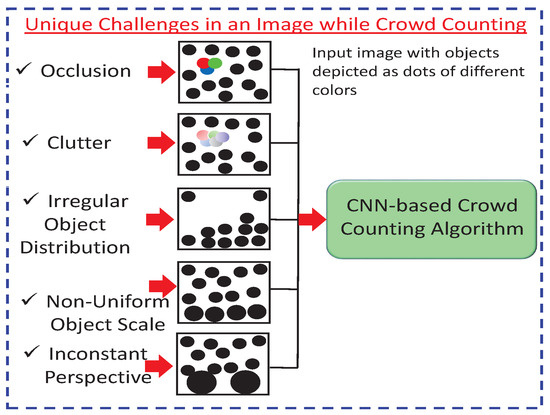 Crowd-counting techniques face many challenges, such as high cluttering, varying illumination, varying object density, severe occlusion, and scale variation caused by different perspectives [18,19,20,21,22]. For instance, high cluttering can distort the resolution of an estimated map, and light illumination can reduce its accuracy. Further, varying object density reduces prediction accuracy due to nonuniform density distribution. Similarly, severe occlusion increases prediction error, and scale variation reduces both counting prediction and density-map resolution.
