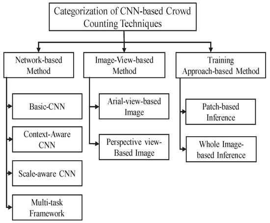 - We categorized CNN-based methods into three main categories to fully understand evolving research aspects. Previously, authors in [26] categorized CNN-based approaches into two main categories (network-based and training-approach-based). However, by reviewing the literature and observing the overall crowd-counting mechanism from different perspectives, we realized the need for a new category, and thus introduced image-view-based methods.