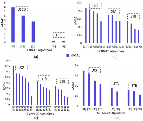 - We provide detailed quantitative comparison (in term of n Mean Absolute Error (nMAE) within each subcategory of the three main categories, and overall performance-based conclusion under different datasets, such as UCF, WE, STA, and STB.