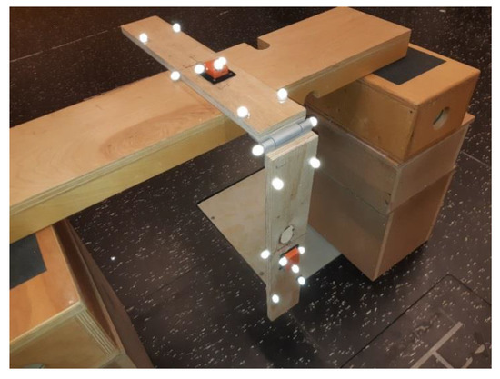 A marker protocol was designed ad hoc for tracking the kinematics of the system. Each bar was equipped with five reflective markers (10 mm diameter) placed at the corners of the bar and one on the side, as shown in Figure 1. Two markers were placed at the extremities of the hinge, centred on the rotation axis. Three additional markers were rigidly attached on each MIMU sensor.