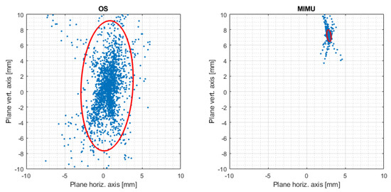 Confidence ellipse for 95% of points of intersection with the reference plane for one trial. Comparison of OS and MIMU. The centres of the graphs represent the geometrical axes.