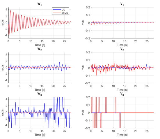 The SAID of the hinge motion is shown in Figure 6. The graphs represented the time window when the angular velocity was above the threshold of 0.3 rad/s. Since the motion was close to a pure rotation, the first invariant, ω1, correctly corresponds to the rotation around the ISA (first graph of first column in Figure 6). The second invariant, ω2, detected some angular variations for the OS system, while it was close to zero for the MIMU. The third invariant, ω3, presented some very large variations for the OS, while it was close to zero for the MIMU. The fourth invariant, v1, was close to zero in the OS case, while some small periodic motion was detected for the MIMU. The fifth invariant v2, also suggested some ISA displacements for the MIMU case, although it was affected by noise. The last invariant v3 showed high oscillations but could not be considered reliable due to the high noise on the previous invariants.