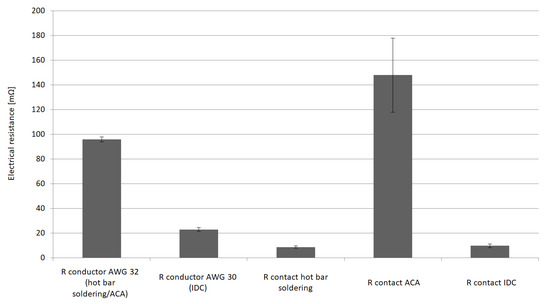 According to the data sheet, the line resistance for hot bar soldering is 100 mΩ per conductor length (length 100 mm, AWG 32) and 25 mΩ (length 100 mm, AWG 32) for IDC. The line resistance can be determined by measuring different conductor lengths. Due to unreliable contacts the samples with adhesive joints could not be examined in all tests.