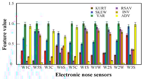 In order to achieve quantitative evaluation of multiple features, parameters including variance, integrals, steady state average, mean differential value, skewness, and kurtosis were selected as time domain features, as shown in Table 3. Variance describes the degree of data dispersion acquired by different sensors, the integral value reflects the total response of the sensor to the gas, the steady state average reflects the characteristic information of the sample, the average differential value reflects the average speed of the sensor’s response to the gas, and skewness and kurtosis reflect the distribution of signals [,,,].