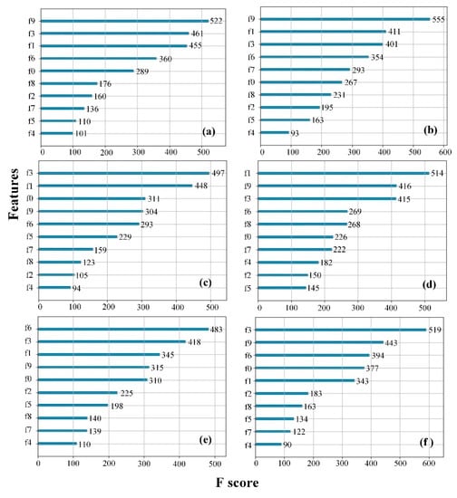 The feature importance based on XGBoost is shown in Figure 3, where the vertical axis represents features and the horizontal axis represents the number of times the feature is used to divide the decision tree nodes. As can be seen from Figure 3, the F-score of each feature for the preferred sensor array is different and the difference in performance is large. Therefore, this study ranks the top 30% of sensors according to the importance of the feature, and 3 × 6 features are preferred by XGBoost. For variance, kurtosis, and skewness, f1, f3, and f9 are selected according to importance; f0, f1, and f3 are selected for integral value (INV); f1, f3, and f6 are selected for average differential value (ADV); and f3, f6, and f9 are selected for relative steady-state average value (RSAV). The numbers of decision tree nodes for the above features are all above 400.