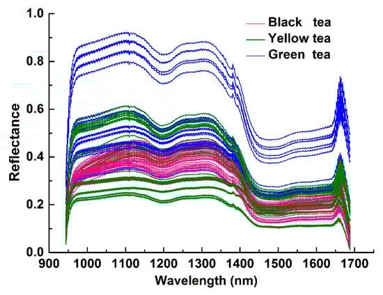 For the same category of tea, different varieties (geographical origins) of tea samples were collected for experimentation. For example, three brands were collected for black tea, including Zhengshan Xiaozhong tea, Qimen Black tea (Anhui Huangshan and Anhui Qimen, China), and Jinjunmei tea. Therefore, 10 varieties were obtained, as shown in Table 1, 10–15 samples were selected for each variety, and 110 samples were used as research objects.
