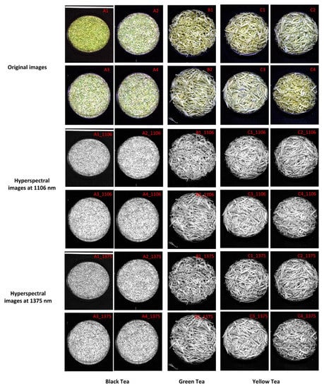 Original images and hyperspectral images based on characteristic wavelengths for three categories of tea. (A1): Zhengshan Xiaozhong ( Fujian); (A2): Qimen Black tea (Anhui Huangshan); (A3): Qimen Black tea ( Anhui Qimen); (A4): JinJunMei (Fujian); (B1): Huangshan Maofeng (Anhui); (B2): Liuan Guapian (Anhui); (C1): Junshan Yinzhen (Hunan); (C2): Huoshan Huangya tea (Anhui); (C3): Mengding Huangya tea (Sichuan) and (C4): Pingyang Huangtang tea (Zhejiang) represent the original images. A1_1106, A2_1106, A3_1106, A4_1106, B1_1106, B2_1106, C1_1106, C2_1106, C3_1106 and C4_1106 represent the 1106 nm hyperspectral images corresponding to the above original images; A1_1375, A2_ 1375, A3_1375, A4_ 1375, B1_1375, B2_1375, C1_1375, C2_1375, C3_1375 and C4_1375 represent the 1375 nm hyperspectral images corresponding to the above original images.)