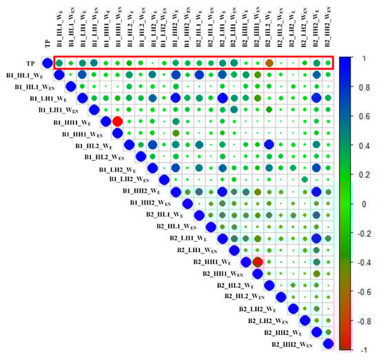 In this study, Pearson’s correlation analysis was performed between 24 features and tea polyphenol content, as shown in Figure 6. The top 25% features with the absolute value of the correlation coefficient were selected. Therefore, six features that were positively correlated with TP were selected for further modeling, namely B1_HL1_WE, B1_LH1_WE, B1_LH1_WEN, B2_LH1_WE, and B2_LH1_WEN; along with B2_HL2_WE, which was negatively correlated with TP. The absolute values of the correlation coefficient of the above features ranged from 0.4 to 0.59.