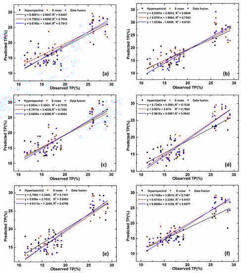 All of the models were built using the preferred features from E-nose and HSI, including the Grid-SVR, RF, and XGBoost; these models performed better than those based on all features. As shown in Figure 7, especially for validation, R2 for E-nose is between 0.754 and 0.81, R2 for HSI is between 0.694 and 0.747, and R2 for fusion features is between 0.816 and 0.90.