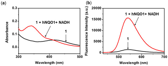 The absorption (a) and fluorescence (b) spectra of probe 1 (5 μM) in the absence (black) and presence (red) of hNQO1 (5 μg/mL) and NADH (100 μM). λex = 410 nm.