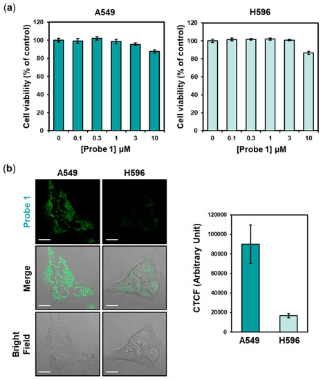 A549 (human lung epithelial adenocarcinoma) and H596 (human lung adenosquamous carcinoma) cells were obtained from the Korean Cell Line Bank (Seoul, Korea). Approximately 2.5 × 104/mL (total volume 2 mL) cells were seeded on glass-bottomed confocal dishes (SPL Life Sciences, Gyeonggi-do, Korea) for two days before imaging. The cells were maintained in a humidified atmosphere of 5% CO2 at 37 °C. The culture media for each cell-line are as below. The cell lines were grown on the same media conditions, specific compositions are as follows: RPMI 1640 (GE Healthcare, Chicago, IL, USA) supplemented with 10% fetal bovine serum (Gibco, Grand Island, NY, USA), as well as 1% penicillin and streptomycin (Gibco, Grand Island, NY, USA). The cells were incubated with 5 μM of probe for 1 h and washed three times with PBS. In confocal laser scanning microscopic experiments, the fluorescence channel was excited at 405 nm and the emission was collected by a 430–540 nm band-pass filter. Magnification of each image was 40×.