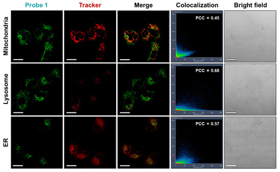 Colocalization images of probe 1 and suborganelles in A549 cells. The cells were incubated with probe 1 (5 μM) for 1 h at 37 °C. The organelles, such as mitochondria, lysosomes, and endoplasmic reticulum (ER), are stained using organelle-selective trackers. The colocalization images were analyzed by the ZEN software (blue edition version) and PCC values indicated Pearson’s correlation coefficient. Scale bar = 20 μM.