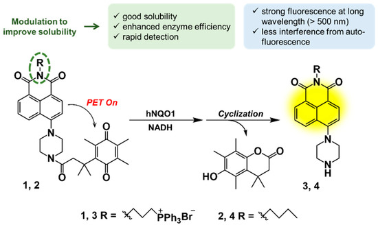 However, the biological roles of hNQO1 in an antioxidant defense system and cancer are not fully understood. Imaging of hNQO1 in cancer cells remains a major challenge. Recently, some fluorescent molecule-based probes that can detect hNQO1 activity in cancer cells have been reported [8,9,10,11,12,13]. Nonetheless, there are limitations such as fluorescence signals being interfered with by cellular autofluorescence and poor solubility. To overcome these limitations, we aim to develop a system that shows enhanced solubility and a high fluorescence signal at a relatively long wavelength (>500 nm) in biological milieus.