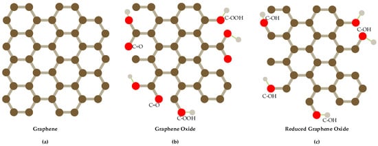 Structures of graphene-based materials show (a) the pristine graphene (pure-arranged carbon atoms) with sp2-hybridized carbon atoms; (b) graphene oxide(GO); (c) reduced graphene oxide(RGO).