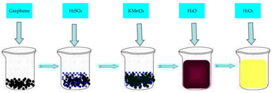 Graphene oxide (GO) is an oxide of Gr, which destroys the bonding network of graphene’s sp2 and is a conductive insulator. The most widely used synthetic method of GO was proposed by Hummers []. The synthesis steps are shown in Figure 4. The surface of GO is rich in epoxy groups and hydroxyl groups and carbonyl and carboxyl groups on the edges, which improve the properties of GR layer and significantly improve the hydrophilicity of Gr layer. As GO is an insulator, its direct application in electrochemical sensing is limited. However, the oxygen-containing functional groups in GO are very beneficial to chemical modification or functionalization, so composite materials are often synthesized with other materials for electrochemical sensing.