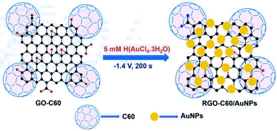 - Rajkumar, C.; Thirumalraj, B.; Chen, S.; Palanisamy, S. Novel electrochemical preparation of gold nanoparticles decorated on a reduced graphene oxide-fullerene composite for the highly sensitive electrochemical detection of nitrite. RSC Adv. 2016, 6, 68798–68805. [Google Scholar] [CrossRef]