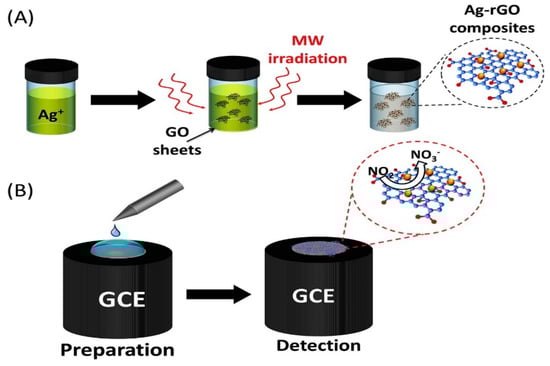 AgNPs and GO composites are the most widely used in the detection of nitrate and nitrite in water. Ikhsan et al. prepared GO-Ag nanocomposites through deposited AgNPs on GO thin films by used garlic extracts and sunlight [] and the nanocomposites modified GCEs (GCE) as electrochemical sensors for the detection of nitrite ions. At the voltage of 0.94V and a pH of 7.2, linear sweep voltammetry (LSV) and Amperometry i-t curves were used for the detection of nitrite by the GO-Ag/GCE. The linear range of the two methods is 10–180 µM and 1–1000 µM, with detection limits of 2.1 µM and 0.037 µM respectively. The electrodes are also selective and show good recovery in actual lake water samples. However, the stability and repeatability of the electrode have not been tested.