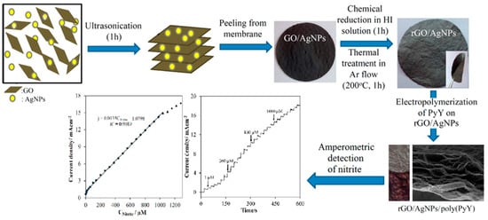 Polypyrrole (PPy) is a common conductive polymer with good conductivity and its hybridization with graphene can enhance conductivity. Ye et al. prepared graphene (Gr)/PPy/chitosan(CS) nanocomposite film modified on a glassy carbon electrode for nitrite []; PPy plays the role of electrochemical oxidation of nitrite and the surface of CS has abundant amino groups and is attractive to nitrite. The Figure 3 show the synthesized progress of Gr/PPy/CS nanocomposites. The modified electrode performs well in nitrite detection, the linear detection range is 0.5–722 µM, the detection limit is 0.1 µM and the reproducibility is 1.8%. Satisfactory results have also been obtained in actual lake and river water samples.