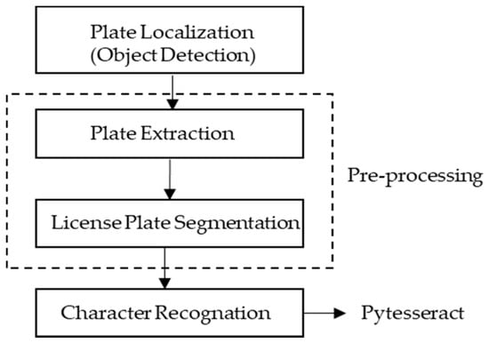 According to Patel et al. [], the development of a conventional ALPR system can be divided into four steps: (1) vehicle capture image, (2) number plate detection, (3) character segmentation, and character recognition. The main functions of steps (1) and (2) are to detect the object (vehicle) and capture the image to find out the potential regions within the image that may contain the license plate. The discussion of the object detection algorithms is beyond the scope of this paper. However, we refer the reader to notable works in [,] for detailed technical discussions of these algorithms. Regarding step (3), the main function is to isolate the foreground characters from the background within the detected license plate region. In step (4), methods are employed to try recognize the characters.