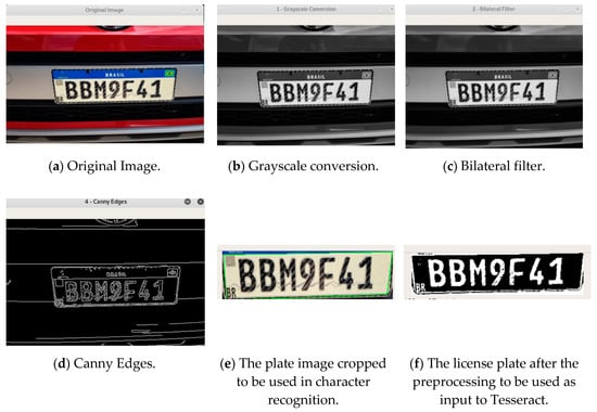 When SPAN detects a vehicle, the proposed algorithm starts the plate localization function to extract the license plate from the vehicle image. This is made by recognizing rectangular objects on the vehicle image. When the proposed algorithm finds a plate on the vehicle image, it extracts the plate area creating a new image. Once the plate image is extracted, it starts the pre-processing phase of the image. The pre-processing is necessary due to variations of the environment (illumination, background, texture) and is aimed at reducing possible noises on the image. It is used in the proposed system as a bilateral filter [] to smooth the image and reduce the noise. After the pre-processing phase, the proposed algorithm uses the Tesseract [] to make the recognition of the characters present on the plate image. The pseudo-code of the proposed algorithm is shown in Section 3.2 below.