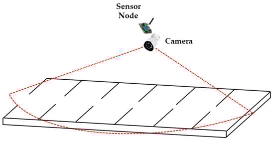 The proposed system is implemented in Python. The hardware used is an Alienware, Intel Core I7, 16 GB of RAM, 1 TB of HD. The Tesseract version used is the 4.0 []. The proposed algorithm is evaluated in real-time using real parking. Figure 5 shows the evaluation scenario, where the red dotted lines show the vision angle of the camera regarding the parking slots. Every time a car arrives, the camera takes a picture of the vehicle and sends the picture to the Data Center that runs the proposed algorithm to find the plate characters as described in the proposed algorithm in Section 3.2.