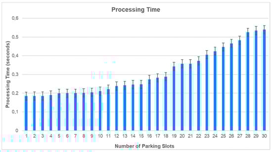 The processing time starting from slot 1 to slot 18 was detected during the day (in the morning and on the afternoon), and the processing time from slot 19 to 30 was detected when the illumination started to get dark, and in this case, it used the parking illumination (in the evening). Figure 7 shows the average processing time.