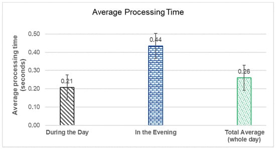 As can be seen in Figure 7, during the day the processing average of the processing time is 0.21 s, and in the evening, the processing time is 0.44 s. The processing time increases in the evening because the illumination in the evening changes, becoming darker. However, the processing time, even in the evening, is low. Considering the illumination in both cases, it is possible to see that the average of the processing time during the whole day is 0.26 s, which is acceptable.