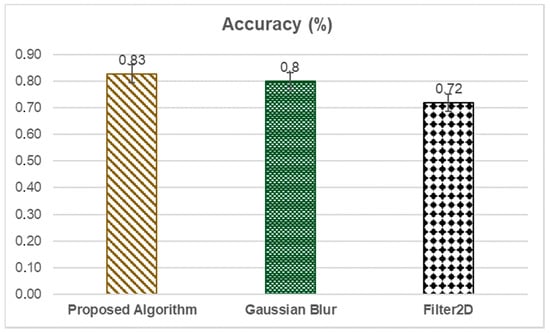 As seen in Figure 8, the accuracy of the proposed algorithm is 83%, and the accuracy of the filters Gaussian Blur and Filter 2D is 80% and 72% respectively. So, the proposed algorithm shows a good result considering the filters Gaussian Blur and Filter 2D.