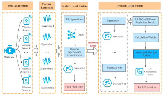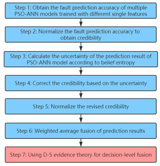 This section introduces the principle of decision-level fusion of multiple PSO-ANN models with different single feature training combined with DS evidence theory (PSO-ANN-DS), which is divided into two subsections. In Section 5.1, the running process of decision-level fusion using four PSO-ANN models with different single feature training combined with DS evidence theory is introduced. The principle of preprocessing new prediction results using prediction accuracy and belief entropy, and the algorithm model of decision-level fusion combined with DS evidence theory, are discussed in Section 5.2.