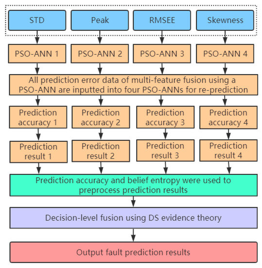As shown in Figure 5, four PSO-ANN models are first trained by different single features (STD, Peak, RMSEE, and Skewness). Then, all prediction error data of multifeature fusion using a PSO-ANN are inputted into four PSO-ANN models for reprediction, and the prediction results and prediction accuracies are obtained. However, it is difficult to directly obtain correct decision results using the DS evidence theory for results with large conflicts. Therefore, the prediction accuracy of multiple PSO-ANN models trained by different single features and belief entropies are used to perform weighted average fusion preprocessing of the prediction results, which is then combined with the DS evidence theory for decision-level fusion. The algorithm flow of decision-level fusion using multiple PSO-ANN models trained with different single features combined with the DS evidence theory is shown in Figure 6.