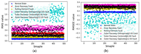 The setting of the sliding window size not only has a great influence on the optimal feature combination, but also has a great influence on the final prediction accuracy. To compare the effects of different sliding window values on the accuracy of final fault prediction, sliding window sizes of 120, 240, 360, 480, 600, 720, 840, and 960 were employed for feature value extraction. Each type of fault data was extracted into 500 groups, and a total of 3000 groups (six different types) were extracted. For example, 500 groups of sample points were each extracted according to the RMS formula and RMSEE formula when the sliding window size was set to 840; the distribution of six different mechanical fault feature sample points is shown in Figure 8.