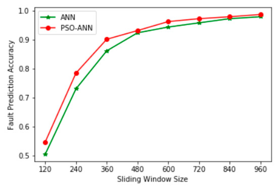 The relationship between the accuracy of fault prediction and the size of sliding window using multifeature fusion with the ANN and the PSO-ANN.