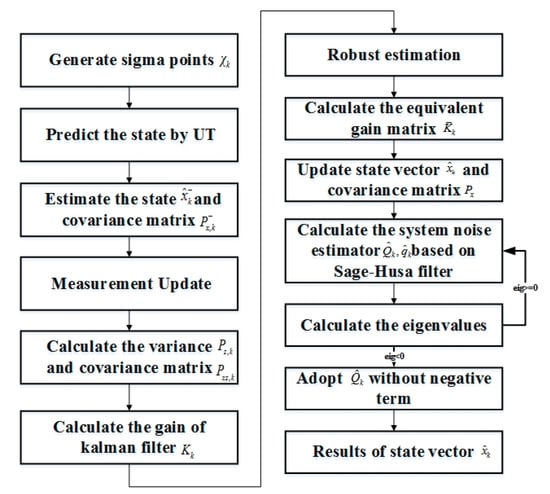 The flowchart of the proposed adaptive robust UKF is shown in Figure 1. The detailed steps of the algorithm are explained as follows:
