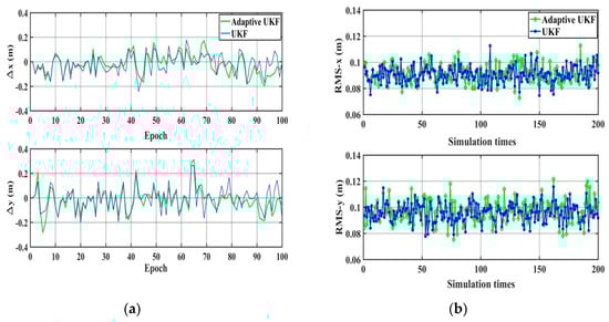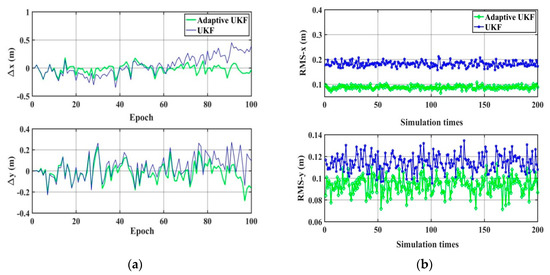 The positioning results of the UKF and the adaptive UKF ( m2). (a) The difference between the true value and the calculation value; (b) The statistical RMS-x and RMS-y of 200 simulations.