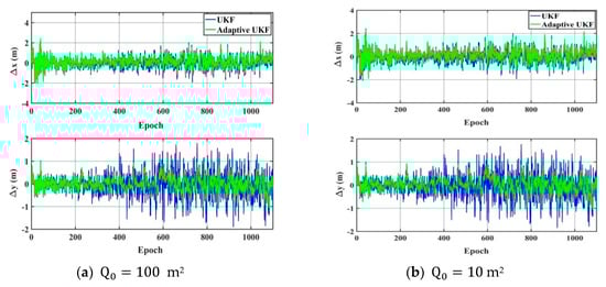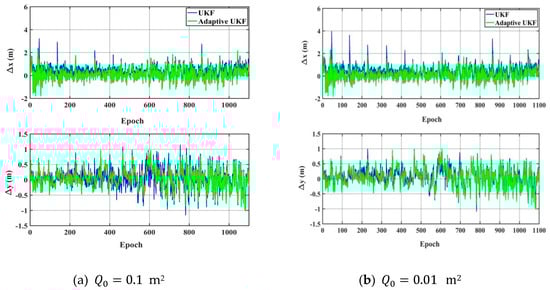 As shown in Figure 6 and Figure 7, when the system noise is set as m2 or m2, the accuracy of the UKF obviously decreases in the horizontal direction, the adaptive UKF can adjust the system noise online, and then improve the positioning results. When the system noise is set as m2 or m2, the positioning accuracy of the adaptive UKF is comparable to that of the UKF in the y direction, and obviously higher than that of the UKF in the x direction. Since the exact system noise is hard to know, we conduct the experiments of the adaptive UKF and the UKF under different system noise levels from 0.001 m2 to 1000 m2, which are shown in Figure 8 and Table 2. From Figure 8 and Table 2, it can be seen that the accuracy of the UKF changes significantly with different system noise values, while the adaptive UKF can obtain more stable and accurate results with minor influence due to changes in the system noise.