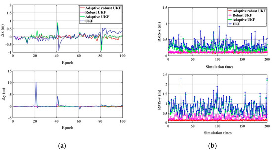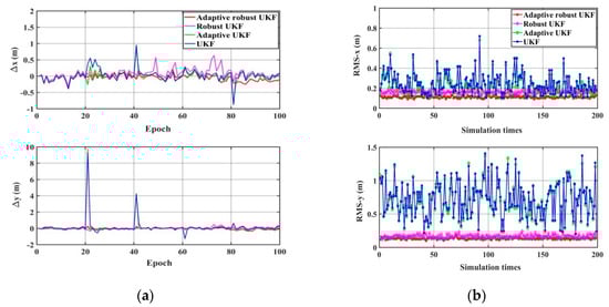 The positioning results of the UKF and the robust UKF. (a) The difference between the true value and the calculation value. (b) The statistical RMS-x and RMS-y of 200 simulations.