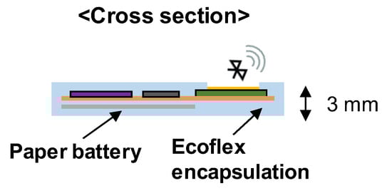 The wearable sleep monitoring sensor consisted of a flexible printed circuit board (FPCB) assembled with chips, a paper battery, and polymer encapsulation (see Figure 1). First, a commercial accelerometer sensor (Analog Devices, ADXL335, Norwood, MA, USA), inverter (NXP Semiconductors, 74HC14, Eindhoven, The Netherlands), relay (MEDER electronics, CRR03-1A, Cincinnati, OH, USA), microcontroller unit (ATMEL, ATmega328P-PU, San Jose, CA, USA), Bluetooth RF module (Waveshare, NRF24L01, Shenzhen, China), and a paper battery were soldered on a FPCB. A mixture of silicone (Ecoflex, 00-30, Smooth-On, Macungie, PA, USA) was poured into a rectangular parallelepiped mold. After removing the bubbles in a vacuum desiccator, the Ecoflex and FPCB were combined and cured for 4 h. For the local patterning in encapsulation, an antenna-shaped aluminum mold was placed onto the antenna, and the Ecoflex was poured, followed by curing for 4 h. The length and width of the wearable sensor was 5 and 3 cm, respectively, and the thickness was approximately 3 mm.