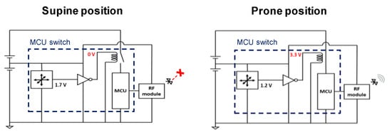 We implemented an electrical switch that supplies power to the MCU and RF module only when the infant is in a prone position. In other words, the MCU switch, consisting of an inverter and a relay, allows power to the energy-intensive components only when they need to be on. A metal–oxide–semiconductor field-effect transistor (MOSFET) switch could be used instead of the relay; however, an additional power source is required to operate the transistor in saturation mode for reliable power supply. We simply configured the switch using a relay device without additional components. Figure 2 explains the operation of the MCU switch. The output of the accelerometer, which detects the infant’s sleep position, is 1.7 V when the infant sleeps on his/her back. It drops to 1.2 V when the infant is in a prone position. The inverter converts the accelerometer output into either 0 or 3.3 V. Then, the relay connects and disconnects the power supply to the MCU and the RF module, depending on the output of the inverter.